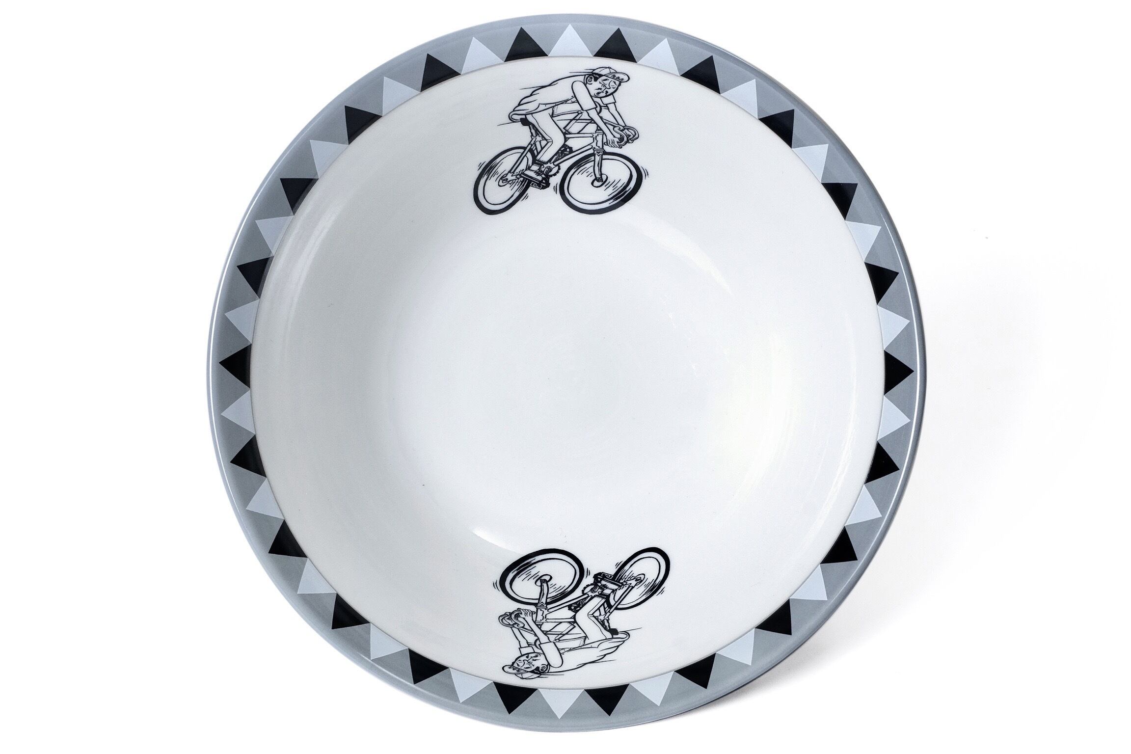 特注で作ったグレーの丼ぶりを、自転車で走り回る姿はまるで競輪のよう。